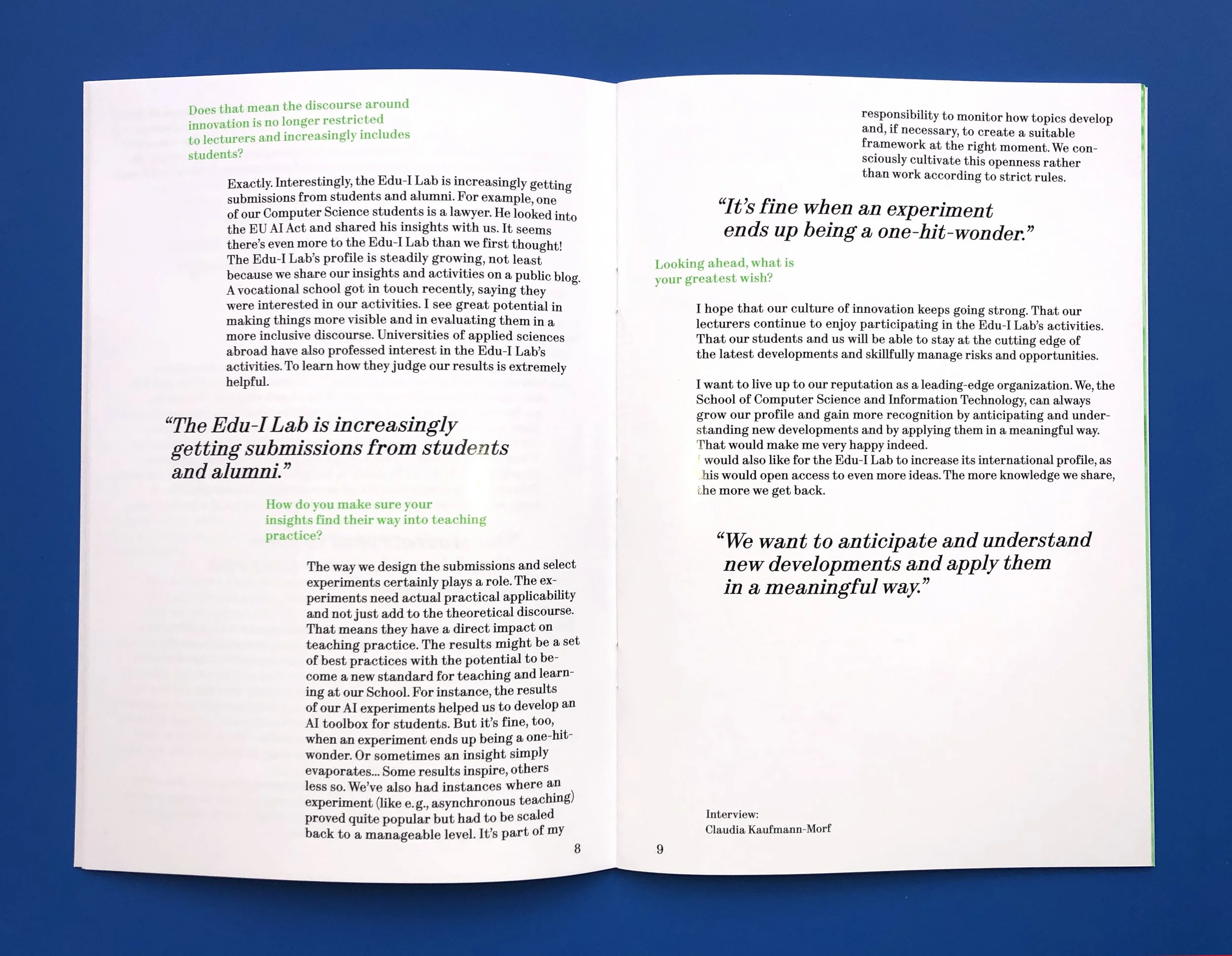 Das Edu-I Lab hat inzwischen eine Strahlkraft entwickelt, die über den Kreis der Dozierenden hinaus reicht: auf Studierende, Berufsschulen und im internationalen Austausch mit anderen Fachschulen. Wie kann man diese Aktivitäten sichtbar machen und teilen? Das Booklet bietet Zwischenbilanz, Überblick und Einblick in einem. Kritisch und aus verschiedenen Perspektiven werden die vielfältigen Meilensteine, Highlights, Flops und Impulse aufgezeigt – genauso schillernd und lebendig wie unser Cover, das mir jedes Mal ein Lächeln aufs Gesicht zaubert.